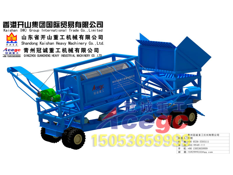 底盤框架主要由30#工字鋼組成,含12條900#輪胎。振動料倉篩條使用工鋼縱向間隔8CM布置,料倉使用5mm厚鋼板焊接。滾筒篩凈篩孔長度3米,內直徑1.2米,外直徑1.5米,含污泥絞洗裝置,主框架使用15#方管焊接,料倉使用5mm鋼板焊接。